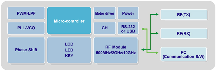Frequency range Standard 500㎒, 2㎓, 10㎓ (A-type) Optional 900㎒, 2.45㎓, 10.4㎓ (B-type) Power range 10mW Approx Modulation frequency 1㎑ ±3% Channel 500㎒/900㎒z(32CH) Output dBm 10dBm(Max) Output Impedance 50 Ohm(Nominal) Type of antenna Yagi, Dipole, Loop, Monopole, Spiral, Helical, Horn, Micro strip etc. Receiver & Main Controller Angle step 400 steps (0.9˚/step) Control motor 2 Phase stepping motor Angle Range 0 ~ 360degree User Display 16 x 2 Text LCD back light User LED 5mm LED : 10ea Keys Tack switch : 9ea PC interface and control RS232C, 19200bps-8-N-1 Channel Switch 8 bit dip switch PLL-VCO Lock 5mm Yellow LED EXT. Input EXT-PWM, EXT-Freq(SMA-KHD) INT. Output PWM, VCO, Phase Shift, Ref-Frequency AC Power Input AC 90~240V / 50~60㎐ DC Power output DC -5V, +5V, +12V Transmit part Fixing(for polarized wave) Horizontal/Vertical ANT. Directional control Manual Receive part Fixing Horizontal/Vertical ANT. Directional control Manual/PC interface for RS232C or USB